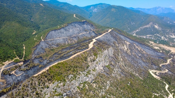Yaklaşık 90 hektarlık ormanlık alanın etkilendiği yangında zarar gören bölge havadan görüntülendi.