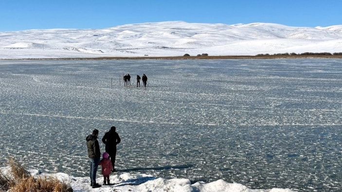 Kızakçılar, gölün donan bölümüne üzerinde büyük bir Türk bayrağının bulunduğu demiri dikerek hatıra fotoğrafı çektirdi.