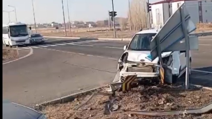 Kazanın etkisiyle araçlardan biri yön tabelalarına çarparken 2 araç da refüje çıktı.