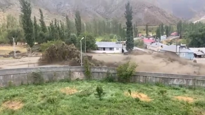Görüntülerde, bir anda gelen sel sularının taşkın koruma duvarına çarpması, direkleri yıkması, köylülere ait malzemeleri sürükleyip götürmesi vatandaşların panik halinde konuşmaları yer alıyor.