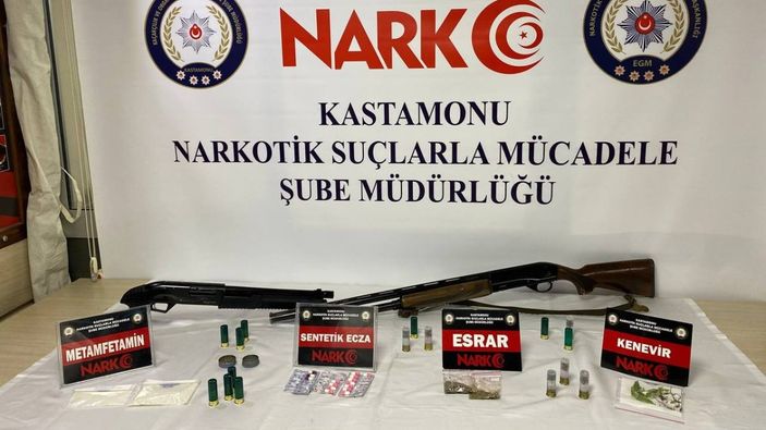 B.C.T. isimli kadın ile birlikte yakalanan K.K. isimli erkek şahsın üzerinde ve ikametinde yapılan aramalarda da çeşitli miktarlarda esrar, kenevir bitkisi, reçeteye tabi hap, 2 adet av tüfeği, 16 adet av tüfeği fişeği, uyuşturucu madde öğütmede kullanılan değirmen ve uyuşturucu madde içiminde kullanılan cam düzenekler ele geçirildi.