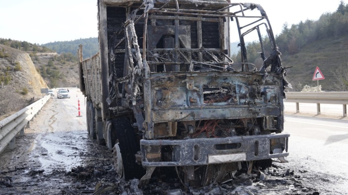 Kastamonu'da seyir halindeyken alevlere teslim olan kamyondan geriye demir yığını kaldı.