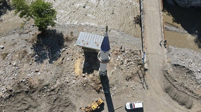 2 yılda iki sele maruz kalan ve camisi geçtiğimiz yılki selde yıkılan minare, bu yılki selde de ayakta kaldı.
