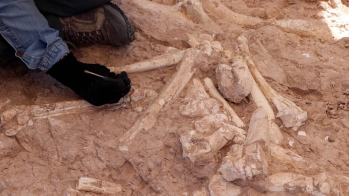 Fosillerin yoğun olduğu yerin etrafını açarak ve bu açtığımız bölge üzerinde, alçı ceket yöntemiyle bütün toprağı kaldırmakla beraber kesek işlemini yapmış bulunuyoruz.”