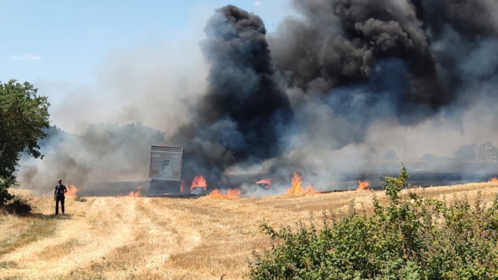 Kırklareli'nde buğday yüklü tırda çıkan yangın anızlık alana sıçradı
