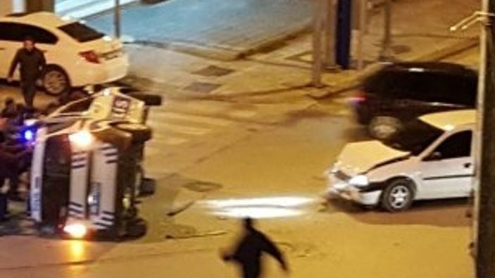 Çarpışmanın etkisi ile polis aracı devrilerek yan yattı.