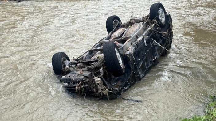 Gebze ilçesinde şiddetli yağış sırasında dereye sürüklenen park halindeki otomobil, suların çekilmesinin ardından sahibi tarafından ters dönmüş halde bulundu.