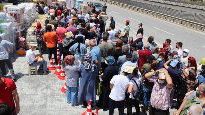 Sırada bekleyen vatandaşlardan Seyhan Doğan ise, “Ben saat 08.30'dan beri bekliyorum. 5 saat oldu, anca alışveriş yapabildim. Hava da çok sıcak, başım ağrıdı sıcaktan. Maskem sürekli takılıydı. O da çok bunalttı. Koronavirüs nedeniyle tedirgin olduk ama yapacak bir şey yok. Bir kere sıraya girmiş bulunduk.” ifadelerini kullandı.