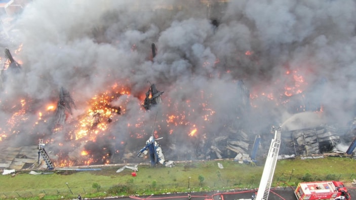 Kocaeli’deki lojistik firması deposunda çıkan yangının büyüklüğü görüntülendi