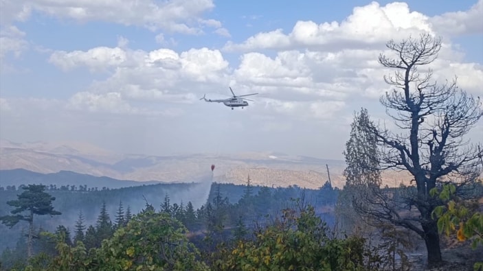 İki helikopterinin söndürme çalışmalarına katıldığı bölgede, çok sayıda arazöz ile yangın kontrol altına alınmaya çalışılıyor.