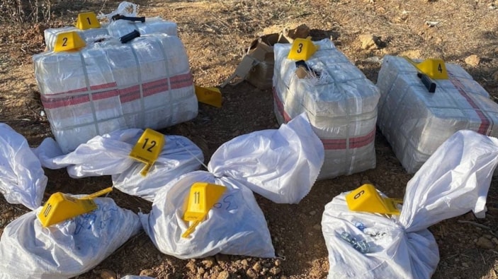 Ekipler yaptığı çalışmayla çuvallara ulaşırken, yapılan kontrollerde çuvalların içerisinde; 417 adet tabanca namlu bloğu, bin 726 adet kancalı demir parçası, 696 adet tabanca icra mili, 633 adet 4 cm'lik yay, 723 adet 3 çentikli demir parçası, 82 adet 7 cm'lik yay, 637 adet 3 cm'lik pim, 190 adet yuvarlak delikli pim, 825 adet 1.5 cm'lik yay, bin 994 adet tabanca şarjörü, 1,5 cm uzunluğunda ince kenarlı muhtelif miktarda yay olduğu tespit edildi.
