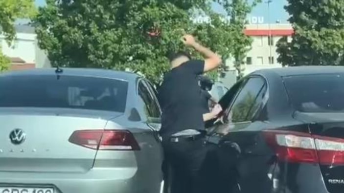 Saldırgan elindeki bıçakla aracın kaportasına da zarar verdi. O anlar, trafikteki başka bir sürücü tarafından cep telefonu kamerasıyla kaydedildi.