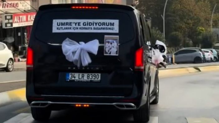 Tuğba Çubuk adlı fenomen, lüks otomobilin arkasına "Umre'ye gidiyorum. Kutlamak için kornaya basın" yazılı bir afiş yapıştırdı.