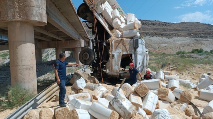 Malatya'da öğle saatlerinde Akyazı Mahallesi'nde meydana gelen kazada, Yakup Çiftçi'nin kontrolünü yitirdiği 80 ADJ 074 plakalı saman yüklü TIR, köprüden düştü.