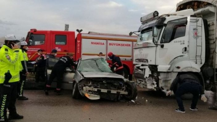 Manisa’nın Soma ilçesi ile İzmir’in Kınık ilçesi arasında bulunan Avdan Mahallesi’nde meydana gelen kazada, Emrah İçke idaresindeki 35 BP 045 plakalı otomobil, Mustafa E. idaresindeki 35 AKG 484 plakalı kamyonun altına girdi.