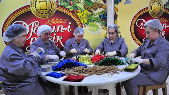 15 kadın tarafından Manisa'yı Mesir'i Tanıtma ve Turizm Derneği imalathanesindeki dev kazanlarda hazırlanan mesir macunları, işlendikten sonra tek tek kağıtlara sarılıyor.