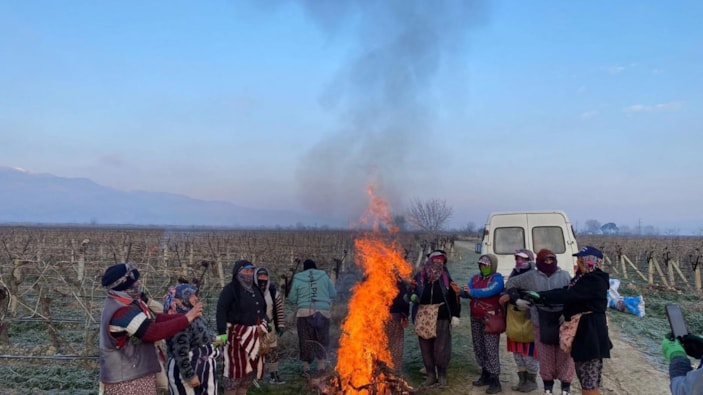 Bağ budama işinde çalışan kadınlar, soğuktan korunmak için ilk iş olarak bağdaki çubukları yakıp etrafında ısınıyor.