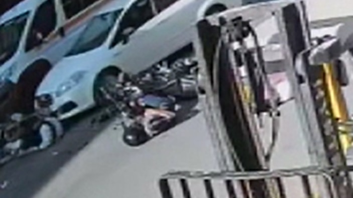 Motosikletlerin çarpıştığı trafik kazası ve sonrasında otomobilin yerde yatan yaralılardan birini önüne alarak sürüklemesi, çevredeki bir iş yerinin güvenlik kamerasına yansıdı.