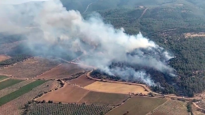 Gölmarmara ilçesinde yerleşim yerlerine yakın bölgede çıkan orman yangınına havadan ve karadan müdahale sürüyor.
