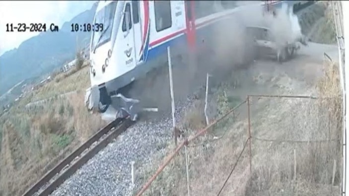 Görüntülerde, otomobilin seyir halinde olduğu ve hemzemin geçide geldiğinde kapalı olan tan tanı son anda fark ettiği, panik yapıp rayların üzerinde durduğu görüldü.