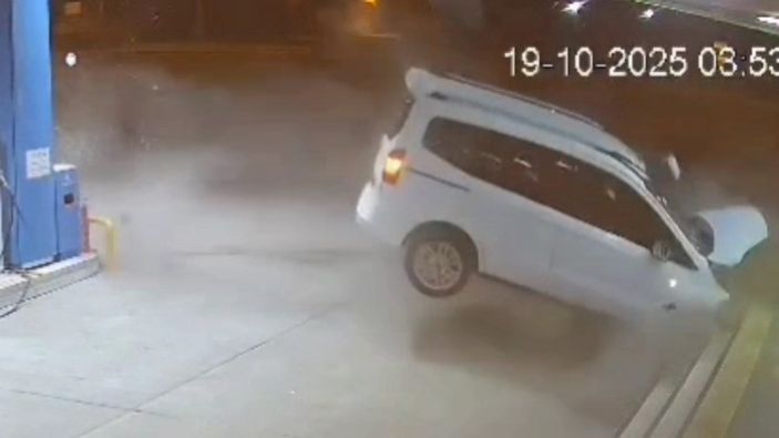 Nusaybin ilçesinde, sürücüsünün kontrolünü yitirdiği hafif ticari araç akaryakıt istasyonuna girip, pompaları sıyırdıktan sonra iş yerinin merdivenlerine çarptı. O anlar güvenlik kamerasına yansırken kazada 1 kişi yaralandı.