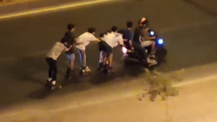 Patenli çocuklardan biri, daha sonra yanlarına gelen başka bir motosikletin arkasına da tutundu.