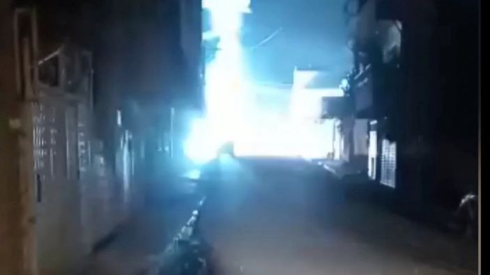 Nusaybin ilçesi Yeşilkent Mahallesi'nde elektrik trafosunun alev topuna dönerek patlama anı bir vatandaşın cep telefonu kamerasına yansıdı.