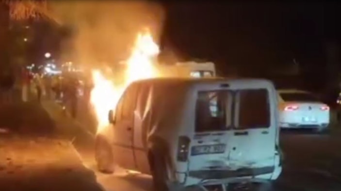 Çarpışmanın etkisiyle hafif ticari araç, motor bölümünden alev aldı.