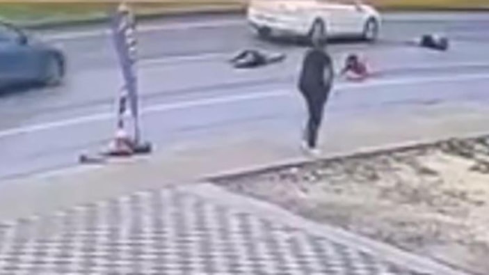 Görüntülerde otomobilin yolun karşısına geçmeye çalışan baba ve iki çocuğuna çarptığı ve ailenin yola savrulduğu anlar yer aldı.