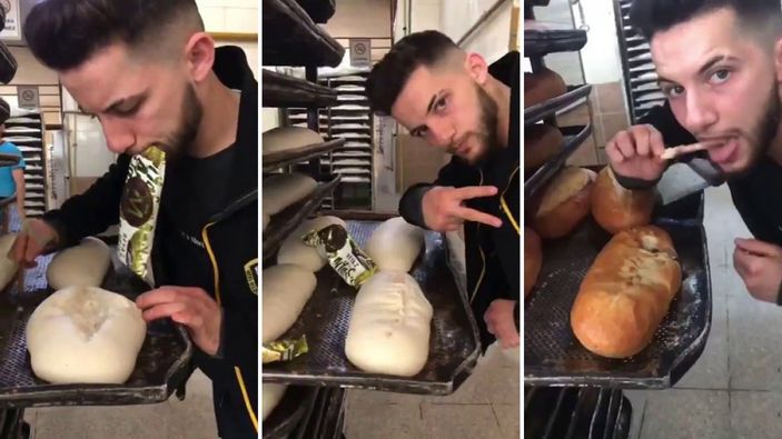 Fırından çıkan ekmeğin ortasını açan kişinin, çıkardığı dondurma çubuğunu yaladığı görülüyor.