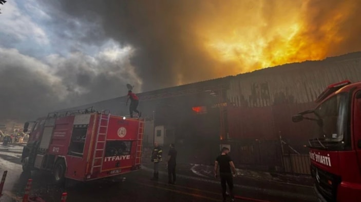 Fabrika alev alev yanarken, itfaiye ekipleri bölgeye ulaşarak müdahaleye başladı.