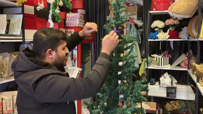Ağaçları yılbaşı gecesi için ışıklandırıp süsleyen Demir, çam ağaçlarını dükkanın önüne koydu.