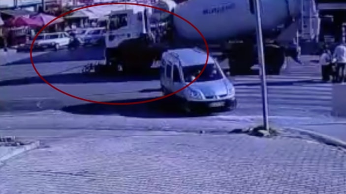 Görüntülerde motosikletin mikserin önünde seyrettiği, çarpma ile birlikte düşüp altında kaldığı anlar yer aldı.