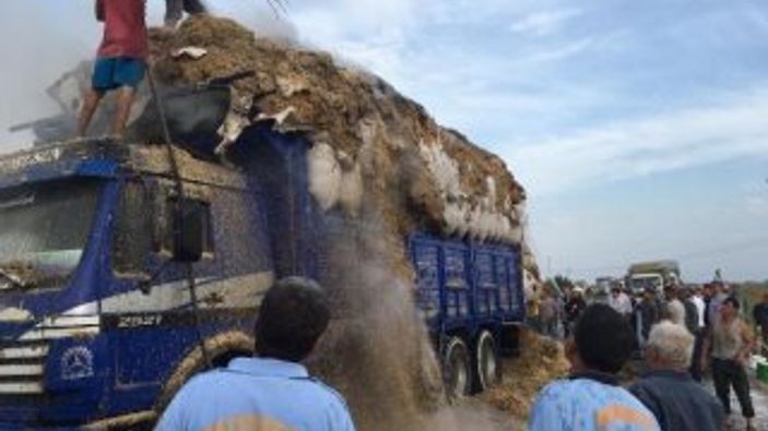Kasadan yükselen alevleri fark eden sürücü kamyonu durdurup diğer 4 çalışan ile birlikte yangına müdahale etti. Kısa sürede alevler tüm saman balyalarını sardı. Sürücüyle çalışanlar samanları yola sererek söndürmeye çalıştı.