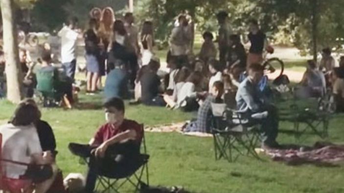 Koronavirüs salgınına aldırmadan müzik eşliğinde dans eden gençlerin, sosyal mesafe kuralını hiçe saydıkları görüldü.