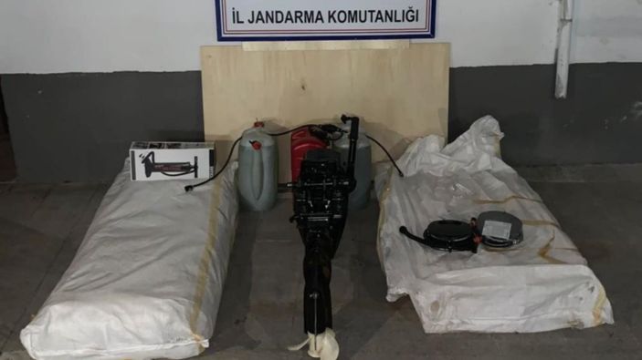 Olay yerinde ve araçlarda yapılan aramada; 1adet lastik bot, 1 adet deniz motoru, 1 adet şişirme pompası, 1 adet mekanik yakıt ikmal pompası, 8 adet ahşap tahta ve 2 adet 65 lt. benzin bidonu ele geçirildi.