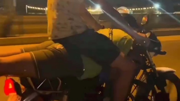 Fethiye'de seyir halindeki motosikletin sürücüsü, kask takmadan yüzüstü uzanarak ilerledi. Üzerine oturan kişi de tehlikeye davetiye çıkardı. O anlar sosyal medyada tepki çekti.