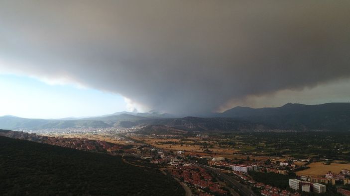 Şehrin farklı noktalarında çıkan orman yangınlarında yükselen dumanlar, gökyüzünün rengini değiştirdi. Gökyüzünün gri hali havadan görüntülendi.