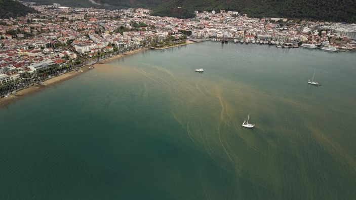 Muğla'da sağanak yağış sonrası çamur rengine bürünen deniz havadan görüntülendi