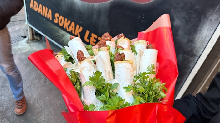 Alev Akgün'ün talebi üzerine çiçekçi Ceren Turan ile iş birliği yapan Şenses, Adana dürümlerini çiçek buketi şeklinde hazırladı.