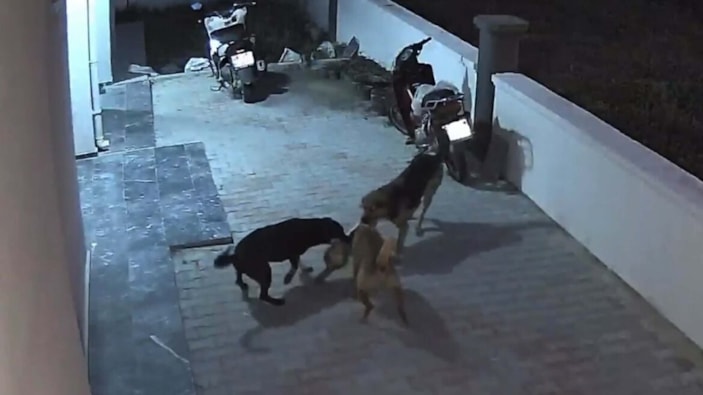 Sokak köpeklerinin saldırısına uğrayan kedi ölürken saldırı anı ise güvenlik kameralarına yansıdı.
