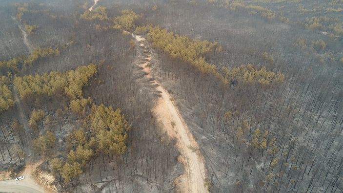 Yanan ağaçlar ve yok olan yeşil doğa, yangından kalan küller ile siyaha büründü.