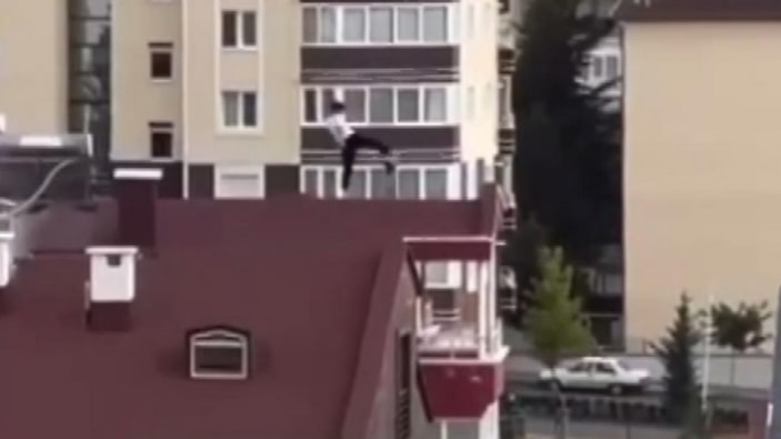 Yürekleri ağızlara getiren bu anlar, çevredeki bir vatandaş tarafından cep telefonuyla kaydedildi. Genç, dakikalarca çatıda spor yapmaya devam ettikten sonra, kendiliğinden çatıdan indi.