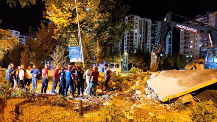 Görüntülerde yıkımın devam ettiği sırada duvarın bir anda caddeye doğru devrildiği, iş makinesinin ise santimlerle yıkılan duvarın altında kalmaktan kurtulduğu anlar yer aldı.
