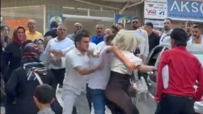 Görüntülerde ayrıca bir vatandaşın bu duruma tepki göstererek, "Bak karşındaki bir kadın" diyerek kavgaya dahil olduğu anlar yer alıyor.