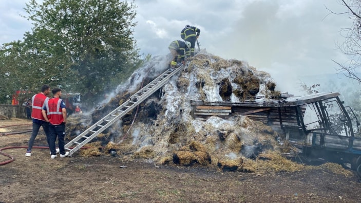 Bir mandırada kamyonete yüklü bulunan samanların alev almasıyla başlayan yangın sonrası kamyonetle birlikte iki zirai tarım aracı ve 100 ton saman kullanılamaz hale geldi.