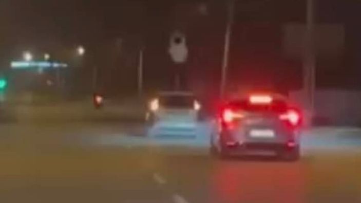 Başka bir araçta bulunan vatandaş, önlerinde seyreden araç üzerinde dans eden şahsı cep telefonuyla kayıt altına aldı.