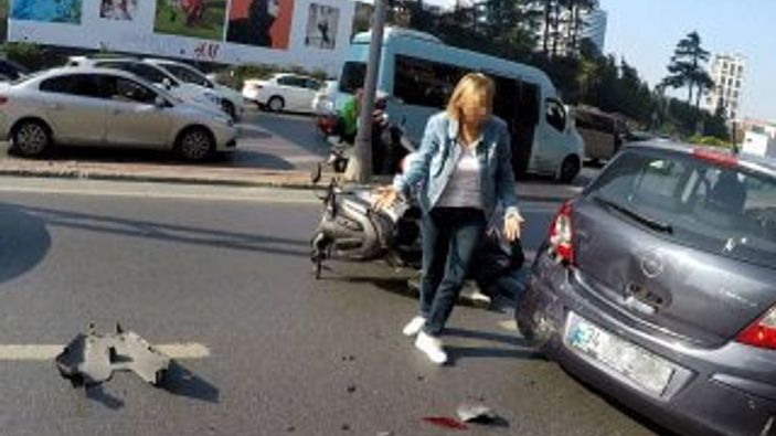 Otomobilin yavaşlamasıyla arkadan gelen motosiklet, araca çarparak takla attı. Çarpmanın etkisiyle motosikletli yere savrulurken, otomobilde ise maddi hasar meydana geldi. Kazanın ardından aracından inen kadın, yerde yatan yaralı sürücüyle ilgilenmek yerine otomobilinin arkasına baktı.