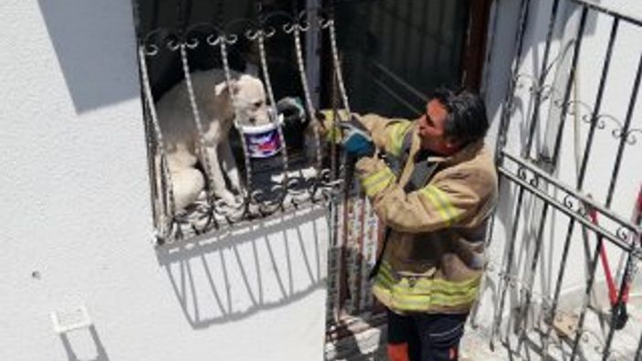 Köpek, ev sahibinin gelip kapıyı açmasıyla itfaiye ekipleri tarafından cam sökülerek kurtarıldı.