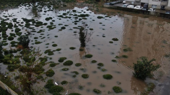 Bahçedeki su yağmurun azalmasıyla kendiliğinden çekilmeye başlasa da ağaçlar sudan tamamen kurtulamadı.